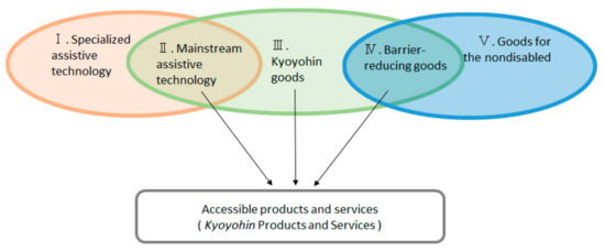 Figure 1 illustrates the basic concept of accessible products and services. These include mainstream assistive technology (II), Kyoyohin goods (III), and barrier-reducing goods (IV).