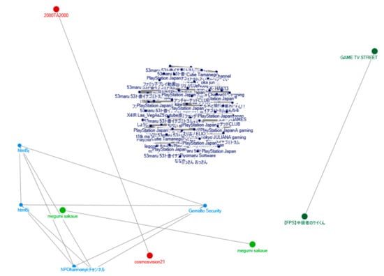 Figure 4 illustrates the network of actors who interacted with the YouTube video about the “color vision support function” (shikikaku sapōto kinou), which is software developed by GungHo Online Entertainment, Inc. (Gungho). The encircled black circle within the network link represents an ophthalmological clinic in Aichi Prefecture, whereas the other small dots around it represent the users of the games. This figure indicates that the function developed by GungHo gained the attention of the game users as well as welfare groups. However, the presence of the Japanese national government within the network cannot be confirmed.
