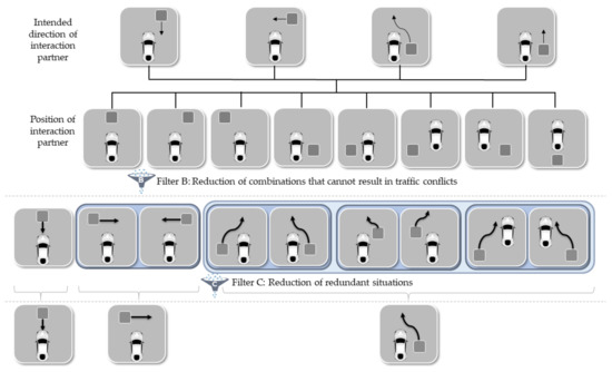 Generic situation-based approach with two filters. Grey squares represent an arbitrary interaction partner, and the white vehicles represent automated vehicles. Blue boxes indicate redundant scenarios.