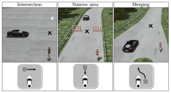 Implementation of the three derived situations in a driving simulation with a cyclist as the interaction partner. The arrows indicate the trajectories of the automated vehicle and the cyclist, and the black cross represents their virtual crossing point.
