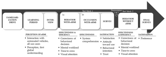 With the introduction of automated vehicles into mixed traffic environments, drivers may be (temporarily) allowed to engage in non-driving-related tasks while driving. As a consequence, the drivers of automated vehicles will often be unavailable for communication while their vehicle is interacting with non-automated road users. To face this change and to ensure safe interactions, there is a broad acceptance among practitioners and researchers that in some situations, automated vehicles may need to replace the informal communication of human drivers (such as gestures and eye contact) with external human–machine interfaces (eHMIs) [1,2]. Currently, eHMI systems represent a completely new and immature technology. Before introducing such a new technological system to the market and to the traffic environment, it is important to carefully determine its usability.