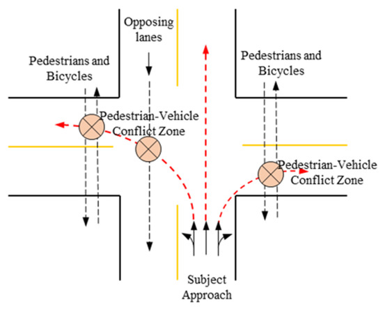 Some researchers analyze the saturation flow rate form a new perspective, and develop statistical models of influencing factors and saturation flow rate, and establish physical models of microscopic traffic characteristics. Saha et al. [13] proposed a new saturation flow model that can accurately estimate the saturation flow rate in India traffic conditions. This model presents four forms—universal Kriging, pseudo-likelihood Kriging, blind Kriging, co-Kriging based saturation flow model. The performance of the new model is better than the conventional model. Shao et al. [14] studied the randomness of the saturation flow rate with a statistical method. It was found that the result of calculating the saturation flow rate may be low with the average value of saturation headways. A new method of estimation saturation flow rates is developed based on the median value of queue discharge headways. Murat et al. [15] built a new model for saturation flow based on driver behavior and vehicle characteristics. The vehicle’s length, acceleration of vehicles, speed of vehicles crossing intersection and reaction time of vehicles in the queue are considered. There is no significant difference between the new model and measured data. Reaction time is the major factor in saturation flow. Vehicle length is also an important factor. Hossain [16] developed a regression model to estimate the saturation flow rate. It was found that the saturation flow rates were dependent on the lane width, percentage of turning vehicles, and the composition of vehicles. Chen et al [24] proposed a four-stage saturation departure model based on an empirical analysis of discharge headways in shared lanes. The model reflects the stochastic nature of vehicle-pedestrian conflict and constructs the logical relationships between shared right-turn saturation flow and its influencing factors.