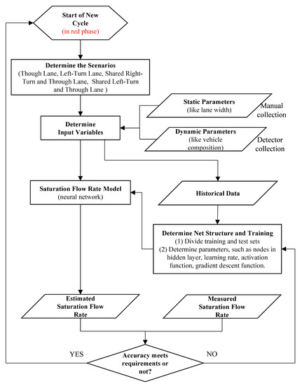 Secondly, the structure of the neural network is determined. The number of nodes for the input layer was the same as all influencing factors (static and dynamic factors). The number of nodes for the output layer was one. The saturation flow rate was measured. Then, the optimal number of neuron nodes in the hidden layer was determined by judging the minimum error. Similarly, the activation function, gradient descent function and learning rate were determined according to the experiment. Finally, a neural network model can be built by training and verifying. The training may spend a lot of time. We could retrain and optimize the neural network at some intervals. The neural network model for dynamic estimation of the saturation flow rate was divided into five steps in this paper. As is shown in Figure 4.