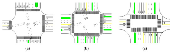 Channelization of signalized intersections: (a) scenario 1 intersection; (b) scenario 2 intersection; (c) scenario 3 intersection.