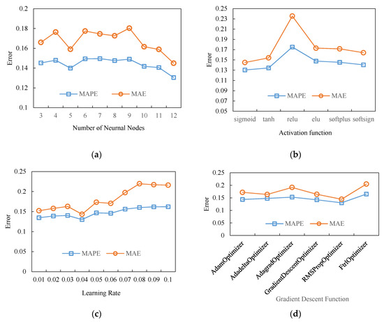 Determining the hyperparameters of neural network models in scenario 1: (a) error changes of number of neural nodes; (b) error changes of activation function; (c) error changes of learning rate; (d) error changes of gradient descent function.