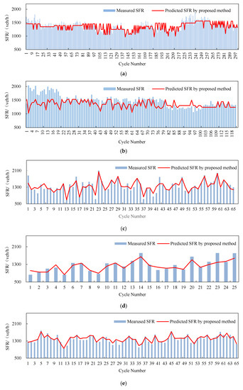 At present, researchers have proposed many estimated saturation flow rate models, which are mainly divided into the following three categories. One is a type of model based on the adjustment method in HCM [4,5,6,7,8] (see Section 2). In consideration of the traffic characteristics of different areas, they revise the existing adjusted factors and add new adjusted factors to improve the original adjustment model. This type of model can clearly express the relationship between influencing factors and saturation flow rates and well assist engineers to make the right decisions. The second one is a type of model based on the estimated departure headway method [9,10,11,12] (see Section 2). The key to this type of model is to determine whether the vehicle’s headways in the queue are saturated. Then, the saturated headways are converted into saturation flow rates. Normally, the saturated headway is related to vehicle size and queue position. This type of model can estimate each position vehicle headway. The last one is a type of model based on statistical and physical methods [13,14,15,16] (see Section 2). They show the relationship between saturation flow rate and influencing factors by a new perspective. However, the above models fail to consider different traffic conditions and influencing factors for real-time prediction in the actual traffic network.