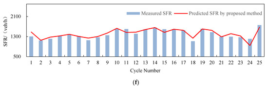 Comparison between predicted and measured saturation flow rate (SFR) with training and test sets: (a) comparison between predicted and measured results with the training set in scenario 1; (b) comparison between predicted and measured results with the test set in scenario 1; (c) comparison between predicted and measured results with the training set in scenario 2; (d) comparison between predicted and measured results with the test set in scenario 2; (e) Comparison between predicted and measured results with training set in scenario 3; (f) comparison between predicted and measured results with the test set in scenario 3.
