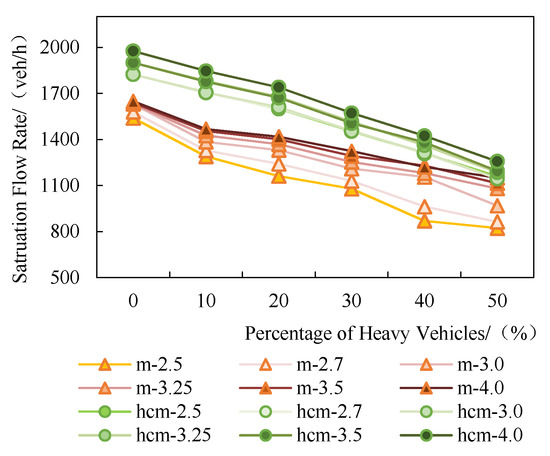 Due to the interaction between adjustment factors, the HCM method can not express the complex relationship between the factors. As is shown in Figure 8, the saturation flow rates for different lane width and different percentage of heavy vehicles were collected in Beijing. The “m” was the measured saturation flow rates. The “hcm” was the adjusted saturation flow rates with the HCM method. It was found that the changes in adjusted saturation flow rates are different from the measured. In the narrow lanes and high percentage of heavy vehicle scenarios, the measured saturation flow rate decreased rapidly. It was shown that there was an interaction between the lane width and the percentage of heavy vehicles.