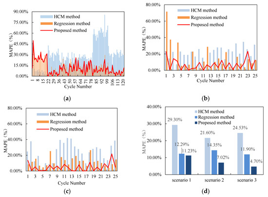 Comparison of the predicted accuracy with HCM, regression and Neural Network methods: (a) error distributions of three models in scenario 1; (b) error distributions of three models in scenario 2; (c) error distributions of three models in scenario 3; (d) the mean absolute percentage error (MAPE) of estimation saturation flow rates for three models.