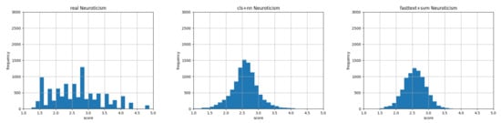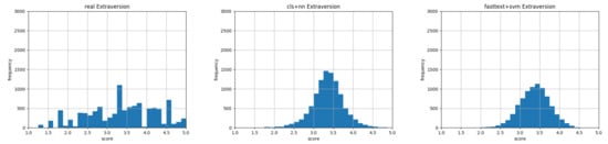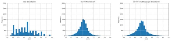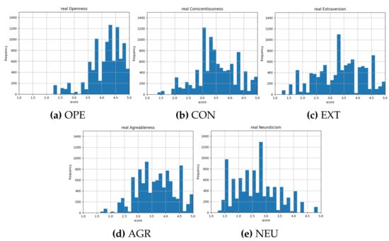 These five scores are retrieved through a Likert questionnaire that has a continuous score ranging 1–5, as suggested in the work of McRae and Costa []. We focused our work on the methodological and computational part of personality trait prediction. Personality traits as described by McRae and Costa [] only measure the general attitudes of candidates, but there are further features of personality in the model called facets that we do not compute in this work. Users clustering or other exploitation of these results are beyond the scope of this study.