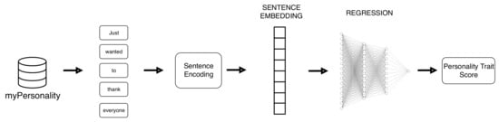 We describe a model to process social media posts, encoding each of them on a sentence level into a high-dimensional array space. We processed this array of 768 features with a stacked neural network to perform a regression on each of the five personality traits in the Big 5 model (Openness, Extraversion, Agreeableness, Conscientiousness, and Neuroticism). Our model is the same for all five personality traits, but it computes them separately, tuning different weights per personality trait. We worked in a supervised environment, where expected personality traits are numbers in the continuous range 1–5 and we predicted them just looking at the textual content of each social media post. The target features came from the myPersonality gold standard. The obtained results have a lower the mean squared error with respect to the existing state of the art. They were also confirmed by the Kullback–Leibler divergence in the data distribution. These results were obtained with a multilingual model that understands 104 languages and then reproduced with the English text only. The code we built is available in a publicly accessible repository (https://github.com/D2KLab/SentencePersonality). Apart from improving the model and testing with different data sources, such as PAN-AP-15 dataset [] and that of Rangel et al. [], we plan further studies in this field. We want to measure the impact of our work when applied with conversational agents and virtual assistants. We plan to experiment on a longer span of time to monitor and understand if and how the personality traits of experiment candidates change. We will tune the answer of conversational agents based on human personality traits. We want to compute them in real time during the dialogue to improve the digital experience in terms of recommendation received and empathy. We aim to encourage serendipity and creativity with this approach. We are also studying the weight of personality traits on the production of viral contents and how to apply it for promoting positive behaviors and for disseminating verified scientific news. We want to build a tool to remove emotions and personality traits from newspaper articles to enhance the objectivity of the fact against the personal opinion of the writer. We aim to build empathetic conversational agents that grow side by side with the user becoming proactive in the conversation and not just passive in questions answering or in command execution. In this scenario, the agent builds its behavior learning from the user it is assisting.