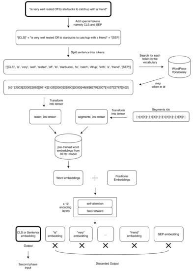 Finally, in [], Vaswani et al. developed an architecture that is made up of both an encoder and a decoder stack. They maintained both the definition of a word embedding made by its context plus a positional encoding embedding stating the probabilities of each word position. They introduced the concept of attention in word embeddings computation. They mapped a query and a set of key-value pairs to an output. This output is computed as a weighted sum of the values through a compatibility function. In [], Devlin et al. exploited and adapted the Transformer model to improve word embeddings extraction and deployment when computed at sentence level. They added the concept of masked token to obtain the word embedding of the masked token through a prediction mechanism based on machine learning.