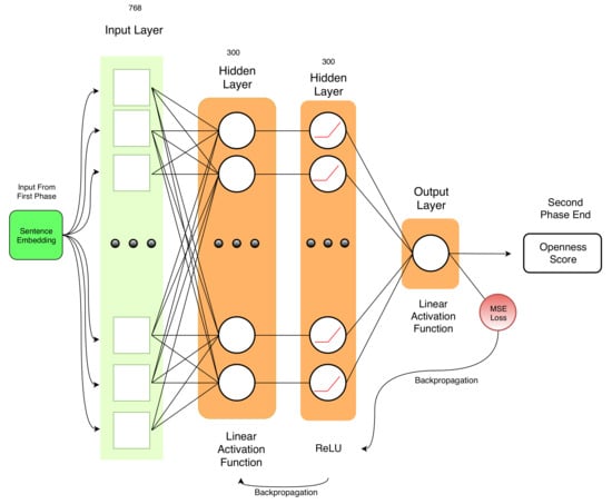 The stacked neural network, illustrated in Figure 5, represents our main contribution. It allows us to define a new state of the art in personality trait prediction from text. As shown in Section 6, we reduce significantly the mean squared error in trait prediction and we also create a smoother data distribution of the predicted scores. In fact, the scores at the tails of the data distribution are detected more correctly than previous models [,,]. Our stacked neural network receives as input the 768-dimensional CLS token from the encoding phase in our pipeline, as illustrated in Figure 2. Then, with a linear activation function in a feed-forward layer, we reduce the dimensionality of the input to 300 dimensions. We adopt the same architecture for each of the five personality traits (Openness, Conscientiousness, Extraversion, Agreeableness, and Neuroticism).