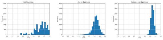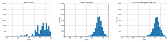 Openness: Histograms representing data distribution of gold standard on the left, our English model result in the middle, and our multilingual model result on the right.