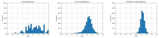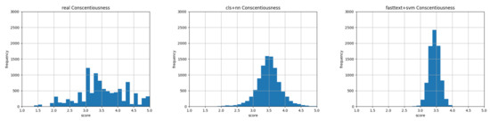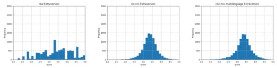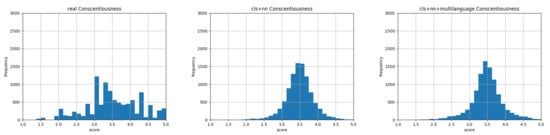The histograms in Figure 6, Figure 7, Figure 8, Figure 9 and Figure 10 show data distribution of personality traits obtained with questionnaire in myPersonality small on the left figures, our predictions in the central figures and predictions of personality traits obtained with the model by Carducci et al. [] in the right figures. Nonetheless, we validated our result with the MSE in Table 3. In all the central figures, our model computes the personality traits still following a Gaussian shape, but it is more capable than the model by Carducci et al. [] to represent values at the margin of the range 1–5 given by the results of a personality trait assessment. On the left of each triplet, there are histograms relative to the personality traits computed through the personality test. These figures show how real values tend to be equally represented; instead, our automatic prediction from text analysis still follows a different shape. Nevertheless, the choice we made went to the right direction to a nearer to truth computation of the personality traits than the current state of the art.