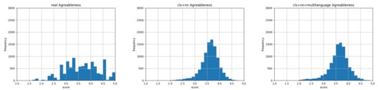 This multilingual model was trained on 104 languages (https://github.com/google-research/bert/blob/master/multilingual.md#list-of-languages). This multilingual model is able to compute word embeddings of 104 different languages. Starting from these embeddings, we performed the regression as described in Section 5. As shown in Figure 11, Figure 12, Figure 13, Figure 14 and Figure 15, the shape of the predicted data distribution multilingual model follows the one created with the predicted English one. To detect an effective improvement in results obtained, we must look at the MSE in Table 3 and at the KL divergence between them in Table 9. The data highlight that, with a model able to understand 104 languages, we reduced the mean squared error and we approximated the data distribution of the myPersonality dataset in a more efficient way. In conclusion, we answered to the second research question by choosing a sentence embedding model trained on a multilingual environment and by changing this element in the encoding phase of our pipeline (Figure 2).