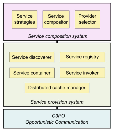 - Conti, M.; Marzini, E.; Mascitti, D.; Passarella, A.; Ricci, L. Service Selection and Composition in Opportunistic Networks. In Proceedings of the 9th International Wireless Communications and Mobile Computing Conference (IWCMC 2013), Cagliari, Italy, 1–5 July 2013; IEEE: Piscataway, NJ, USA, 2013; pp. 1565–1572. [Google Scholar]