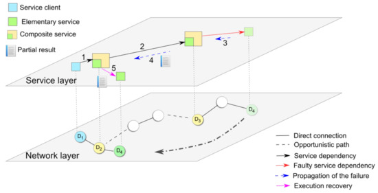 Composition of services and invocation of composite services have been widely studied in the past, mainly considering Web services in stable Internet legacy networks [9,10]. They also have been considered in networks composed of resource-constrained devices in the Internet of Things context [11,12,13,14], as well as in more challenged networks, such as in dynamic pervasive environments formed by mobile ad hoc networks [15,16,17]. Most of solutions proposed for these kinds of networks do not tolerate the connectivity disruptions that can unpredictably occur between devices, and that can introduce additional delays and failures in the invocation processes. For instance in [16], Barakat et al. have proposed an adaptive service composition algorithm that triggers an adaptation process as soon as service changes occur in the environment, without interfering with the initial execution process, unless necessary. This adaptation process applies only a minimal number of modifications to the initial composition graph to avoid a service re-selection from scratch. The new composition graph resulting from this service re-selection is executed in a parallel process in order to maximize the chances of a successful recovery and to reduce the execution time of the composite service. This work does not describe the service selection criteria, and only considers the selection problem from a high level point of view, which does not make it possible to determine whether the proposed approach is suitable or not for dynamic network environments that are subject to frequent and unpredictable connectivity disruptions.