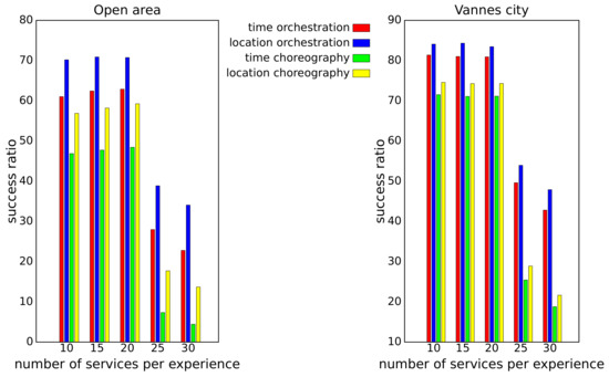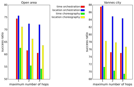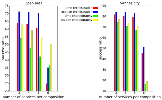 Figure 5 shows the success ratio against the number of services per composite request. The invocation success ratio decreases when the number of services to compose increases, because the number of failures (or interruptions) in the invocation processes increases with the number of services. In our scenarios, the failures or the interruptions are mainly induced by the mobility of the devices. Like in the first evaluations, the configuration that provides the better success ratio is the orchestration-based strategy with the LUF. The reasons are the same as those related to the variation of the number of hops. For example in the open area scenario, the orchestration–based strategy provides an invocation success ratio between 35% and 71% with the LUF, and between 25% and 64% with the TUF. In the sport event scenario, the gap between the two strategies and the two utility functions is reduced, and the ratio is better than in the open area scenario, due to the mobility of people being constrained by the running path, as mentioned before. Therefore it is easier to meet service providers.