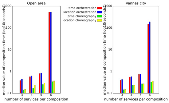 In this paper, we have presented a service composition system that leverages service redundancy to improve the execution of applications designed as an assembly of composites services in opportunistic networks. This system implements an automatic composition of services from discovered services, according to the users’ interests. In contrast to related works presented in Section 2, which only consider choreography-based invocations of composite services, the invocation process of a composite service in our system can follow two different strategies, based on orchestration or choreography. Like in [8,20,22,23], invocations of composite services can be recovered from partial failures. A key feature of the composite service invocation process is the ability to select the best provider at each step. To do so, [18,19,20] consider the mobility pattern of devices and their colocation duration. In [23], the service execution times and an estimation of the remaining execution path’s reliability help select providers, while in [5] this is the minimum time needed to send data from one node to another and the service load. In this paper, we have investigated two alternative implementations of a utility function at the basis of this service selection: one based on location and the other based on the reception times of the service advertisements emitted by service providers. These two implementations make it possible to take into account the nodes’ colocation property, an estimation of the time needed to invoke a remote service provider and an estimation of the success rate of a service invocation. These two implementations can serve both the orchestration and the choreography invocation strategies.