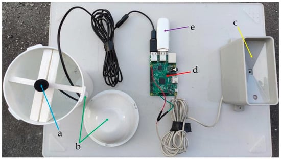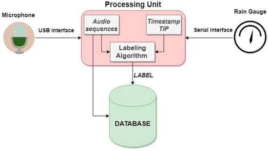 The database was created ad hoc using the acquisition system represented in Figure 1. This system consists of a microphone and a tilting rain gauge connected to a processing unit. The processing unit houses an algorithm for labeling the audio files that allows aggregating different audio sequences in the corresponding class of precipitation intensity. Once the audio sequences are labeled in their respective intensity classes, they are entered in the database.
