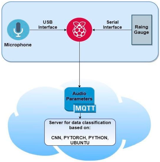 The microphone sensor is connected via USB cable to the Raspberry Pi, where a processing phase of the collected data is carried out. The processing unit, in fact, implements the labeling algorithm described above, enabling the generation of 30-s audio sequences, which correspond to a certain class of rainfall intensity. The obtained data are sent via a cellular connection (4G dongle) to the cloud, entered in the database and subsequently given as input to the neural network for the training phase.