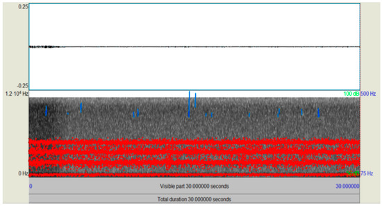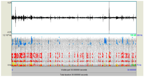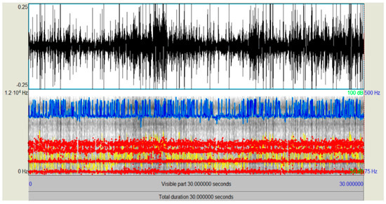 The first example of analyzed audio sequence belongs to the “No rain” class; Figure 4 shows the waveform of the audio signal lasting 30 s and the corresponding spectrogram.