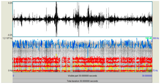 Additionally, in this case there is a difference in the spectrogram and an increase in the range of the amplitude of the audio signal and the level of signal intensity, compared to the previous levels. Furthermore, it is evident that the frequencies of the formants and of the pitch are lower than at the “Moderate rain” level. Finally, the formants recover a certain continuity over time.