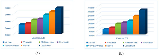 ZCR values for different rainfall classification levels: (a) average of ZCR values; (b) variance of ZCR values.