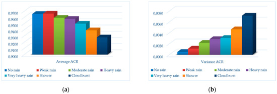 Figure 8 shows two graphs, the first (a) shows the values relating to the average of the ZCR for all precipitation levels, while the second (b) shows the variance values of the ZCR. In both cases, we note that as the rainfall level increases, the mean and variance of the ZCR increases. The variance of the ZCR of the “No rain” case is slightly higher than that of the “Weak rain” class due to the presence of non-stationary environmental noises (e.g., bubble or street noise) which, although in attenuated form, slightly interfere with the characteristics of the audio signal relating to the “No rain” case. In addition, the reason why the zero crossing rate increases as the signal intensity level increases is due to the fact that, as the intensity and frequency increase, the signal will cross zero several times over time. Crossing zero several times means that the digital signal will pass from positive to negative values (or vice versa) very frequently.