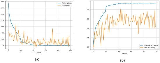 Figure 12a shows the progress of the training losses (blue curve) and the test losses (orange curve); both curves decrease with increasing epochs. Conversely, Figure 12b shows that the trend of training accuracy and test accuracy increases with increasing epochs.
