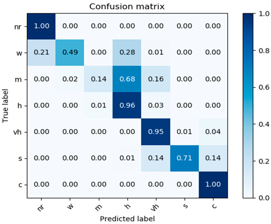 Figure 13 shows the confusion matrix obtained by processing the test audio sequences inputted to the CNN network. It is possible to observe good classification of the seven levels of rainfall intensity with an average percentage of 75%, which rises to 93% if the misclassifications of the adjacent classes are not considered. In particular, we have an excellent classification for “No rain” (100%), “Heavy” (96%), “Very heavy” (95%), and “Cloudburst” (100%). The level of accuracy in percentage can also be improved by inserting a post-processing block represented for example by a median filter.