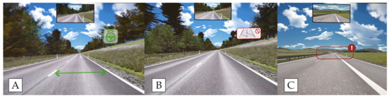 Examples of the Digital In-car Tutor visuals. (A) Visuals while the digital tutor verbally explained Lane Keeping. (B) Visuals when the digital tutor verbally explained that the automation cannot deal with overly complex lane markings. (C) Visuals when the digital tutor reminded the driver that the automation had trouble driving in bad weather conditions such as heavy rain and fog, and that the weather would be changing.