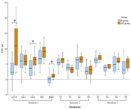 During the first driving session, the DIT group showed larger Times To Collision (TTC) at take-over in three (ACC2, OD2, and RM2) out of five scenarios that required a take-over (Figure 4). For the scenario ACC2, the DIT group took back control significantly earlier (MDIT = 11.30, SDDIT = 7.54) than the IB group (MIB = 3.48, SDIB = 3.57) (t(20.59) = 3.80, p = 0.001). The DIT group also took back control significantly earlier in the scenario OD2 (t(27) = 2.45, p = 0.025), with a mean TTC of 6.19 s for the DIT group (SD = 2.55) and 3.67 s for the IB group (SD = 2.92). Similarly, the DIT group took back control significantly earlier in scenario RM2 (t(21.63) = 2.27, p = 0.034). In this scenario, the mean take-over distance was even negative for the IB group, indicating that take-over after the collision location had already passed (MIB = −0.03, SDIB = 2.12) (MDIT = 1.24, SDDIT = 0.93). In Sessions 2 and 3, it still appeared that the IB group took back control later in most scenarios that require a take-over; however, these results were not significant.