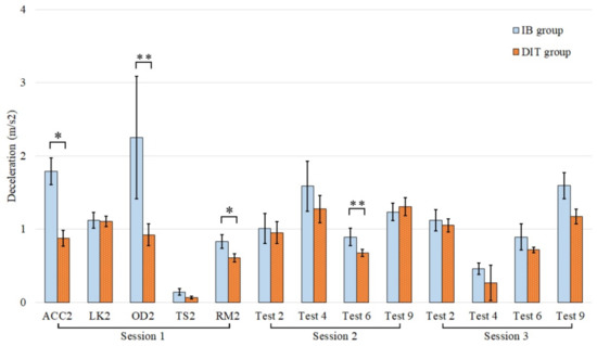 During Session 1, the deceleration rate (m/s2) was higher for the IB group in the same three scenarios in which the IB group showed later take-overs (ACC2, OD2, and RM2) (Figure 5). In scenarios ACC2 (MIB = 1.79, SDIB = 0.79, MDIT = 0.88, SDDIT = 0.44) (t(34) = 4.12, p < 0.001) and RM2 (MIB = 0.83, SDIB = 0.38, MDIT = 0.61, SDDIT = 0.23) (t(34) = 2.10, p = 0.043), the IB group decelerated significantly faster. This was also the case in scenario OD2, but only on a 0.1 significance level (MIB = 2.25, SDIB = 2.89, MDIT = 0.92, SDDIT = 0.61) (t(28) = 1.85, p = 0.075). During the second session, only scenario Test 6 showed a difference between groups on the deceleration rate on a 0.1 significance level (MDIT = 0.68, SDDIT = 1.97, MIB = 0.89, SDIB = 2.51) (t(36) = 1.72 p = 0.093). None of the scenarios in Session 3 showed significant differences on the deceleration rate between groups.