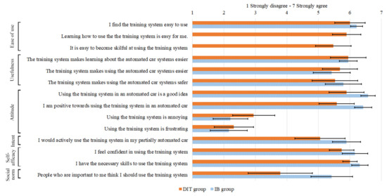 At the end of the first session, participants rated their agreement to several statements about their training on a scale of 1 (Strongly disagree) to 7 (Strongly agree) (Figure 6). Overall, the participants of the DIT group agreed that the DIT was easy to use (M = 5.79, SD = 0.93, 95% CI = 5.34–6.24) and useful (M = 5.72, SD = 1.18, 95% CI = 5.15–6.29). Participants were positive towards the DIT (M = 5.74, SD = 1.11, 95% CI = 5.20–6.27), and disagreed that it was annoying or frustrating (M = 2.63, SD = 1.28, 95% CI = 2.02–3.25). Furthermore, participants showed the intent to use the DIT if it was in their partially automated car (M = 5.05, SD = 1.65, 95% CI = 4.26–5.85), and felt that they were capable of using it (M = 5.87, SD = 0.47, 95% CI = 5.64–6.09). Participants disagreed that people who are important to them think that they should use the DIT (M = 3.79, SD = 2.12, 95% CI = 2.77–4.81). This seems logical as their friends and family most likely do not know about the system. The acceptance ratings could not be compared as each group only experienced one training method.