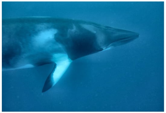 A predictable aggregation of dwarf minke whales [] (Balaenoptera acutorostrata subsp.) occurs in the Australian waters of the northern Great Barrier Reef (GBR) in June and July each year. The dwarf minke whale is the second smallest baleen whale, born at approximately 2 m in length and growing to a maximum measured length of 7.8 m []. While in the northern GBR, these whales regularly interact with people and boats []. To date, there is no population estimate for this undescribed subspecies, and the GBR aggregation represents a unique opportunity to study and improve our understanding of this poorly-known whale. Since the mid-1990s, a tourism industry has established around this aggregation, providing swim-interactions for dive tourists [,], as well as “platforms-of-opportunity” for researchers to collect various data, including underwater images of individual whales [,,,,,]. The whales’ natural colour patterns are complex (especially around their head and shoulder areas), individually variable, and likely remain stable through a whale’s life, enabling photo-identification (photo-ID) of individual animals [,,,], see a typical example in Figure 1.