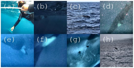 Investigating the large false-negative rate (second row of Table 2) revealed that training with different compositions of the negative and positive pools of images made the numbers of false-negatives and false-positives highly unstable and oscillating. The main reason for the instability was traced to the first strictly technical definition of whale-detection. For example, Figure 6a contained the tail sections next to the person’s knee. When such images were added to the pool of positive images, any other objects in the images were effectively labelled as a “whale”. To overcome this problematic effect of the per-image labelling, it was discovered that both false-negative and false-positive rates could be consistently improved by using negative-labelling. For any false-negative erroneous classification, the negative-labelling technique consisted of creating a corresponding negative image by editing the whale out of the image, see sample pairs in Figure 4e,f, as well as (g) and (h). Then the original positive image was added to the pool of positive images and the corresponding manually edited negative image was added to the negative pool.