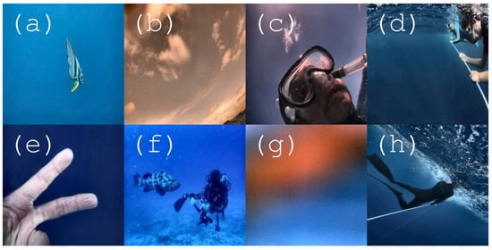 The MWS-2018i collection of 11,704 images was sorted by the first version of MWD (MWD-v1) and manually verified and, if needed, corrected. Examples of the first-cycle false-positives are displayed in Figure 3, which illustrate the diversity of the imagery. Conceptually and technically, the false-positives were easy to deal with by adding them to the pool of negative training images for the next train-predict cycle. However, the false-negatives presented a pivotal point of the study, see Figure 2. For example, Figure 2a technically has a whale in it (as per the first definition of whale-detection), which is the unidentifiable whale next to the person’s hand. Similarly, the above-water images in Figure 2c,h contain whales but the images could not contribute to the photo-identification.