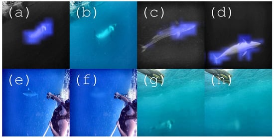 In this study, we extended this approach to videos where cameras were constantly moving. Therefore, the negative video frames without a whale were often visually very different from the positive frames containing the whales. As such, the difference in positive and negative images could be very large and still assist effective training, as was the case of moving debris and underwater vegetation in the underwater fish detection []. In the surveillance videos [,], the “intuition” was that moving/changing background items repeat themselves in some fashion in both negative and positive images. Hence, a CNN could learn to identify the objects only present in the positive frames, for example, fish in Reference []. However, the same intuition worked equally well in this study, where a vast number of items, textures and/or patterns often appeared only in positive examples and therefore were incorrectly learned as a “whale” by the CNN. This problem was solved here by inventing a negative labelling technique, where in relatively small number of cases (less than 100) the whales were manually edited out by blurring or excessive distortion.