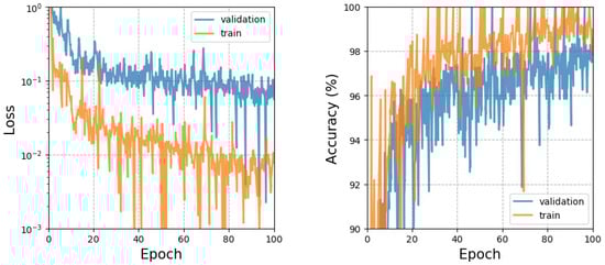 The actual training history of the final MWD-v4 CNN is illustrated in Figure 7, where 16,471 manually verified and/or labelled images (see Table 2) were split 90% for training and 10% for validation. Note that the full range of the considered image augmentations (via the Albumentations library []) was applied while collecting the loss and accuracy performance metrics for the validation subset. Hence, the validation accuracy was still fluctuating between 96% and 100% values even during the last epochs of training.