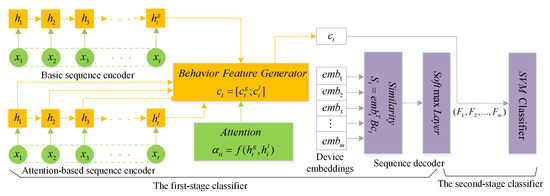 where T is a matrix and is the dimension of each device embedding, which, for mapping each behavior, vectors to a low-dimensional space. is the dimension of the sequence representation. Then, the similarity score of each device is fed into a softmax layer to acquire the probability to achieve decoding.