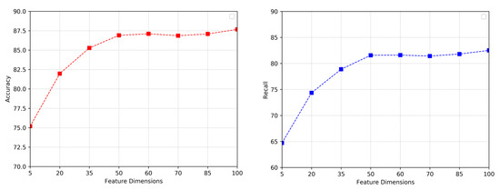 Accuracy and recall of the SPC model with the impact of different feature dimensions.