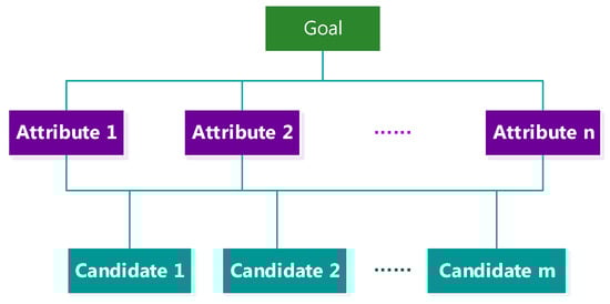 Step 1. Modelling a hierarchical structure of the evaluation index system. There always contain at least three layers, named goal layer, attribute layer and candidate layer, as shown in Figure 2. The goal layer, which is the highest level, describes the purpose of the evaluation. The attribute layer is the decomposed criteria of a candidate, and evaluation by experts are mainly based on it. This layer can be decomposed to more sublayers, according to the actual situation. The candidate layer is the object of evaluation.