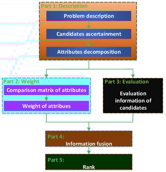 In this section, a new method for quality goals evaluation based on D number theory and FAHP, named D-FAHP method, is proposed. The flow of D-FAHP is shown in Figure 3. The processes of D-FAHP can be divided into five parts, as description (Part 1), weight (Part 2), evaluation (Part 3), information fusion (Part 4) and rank (Part 5).