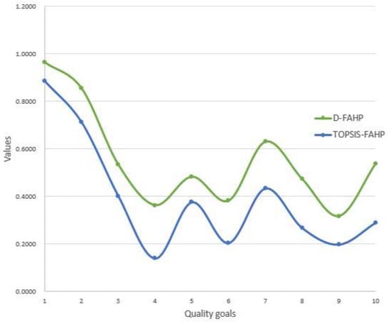 One industry association in Serbia want to investigate the situation of quality goals and to choose the finite quality goals to improve []. A total of 52 companies with similar business processes and with similar size are chosen as an example. A management team compound of association experts and quality managers of each company is set up to do the process of evaluation. As the similar companies are considered, it is realistic to assume that all the decisions made by management team are consensus and valid. The proposed D-FAHP method is carried out to solve the ranking problem of quality goal, as follows.