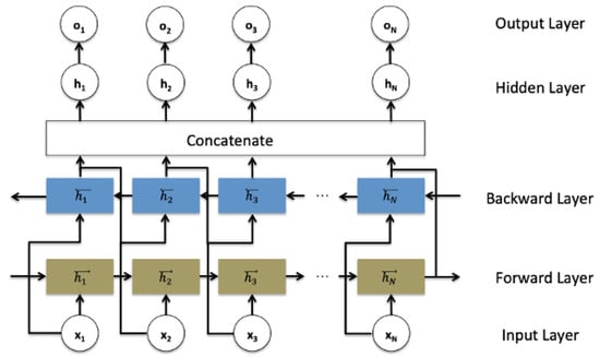 Such a network may integrate two independent RNN, LSTM, or GRU models, where every input in the sequence data is fed at the time order for one network that is composed of sequential units, and then at the reverse time order for another network. The outputs of the two opposite directional networks forward (f) and backward (b) are concatenated at each time step to generate the final hidden layer ht−1 which is used to generate the output layer ot, as detailed in the following Equations (11)–(13):