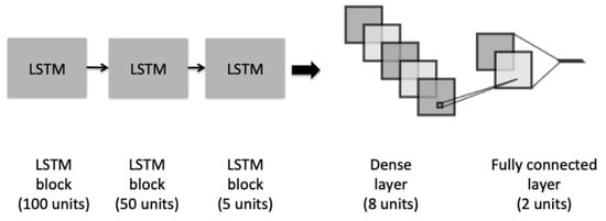 The second architecture is depicted in Figure 3, which illustrates an LSTM model, composed of three different blocks of LSTM. The initial block contains a recurrent dropout rate that helps to drop a fraction of units for the linear transformation of the recurrent state. Before adding the last fully connected layer, we added a dense layer with an L2-regularization to penalize the learning during the optimization.