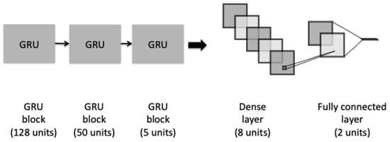 A third architecture is a GRU model, as shown in Figure 4. The model has a similar architecture to the proposed LSTM. It consists of three different blocks of GRU and a recurrent dropout rate in order to help to drop a fraction of units for the linear transformation of the recurrent state. The last fully connected dense layer was added preceded with an L2-regularization dropout layer.