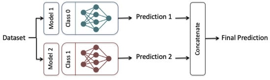 We proposed an ensemble-learning framework that trains two independent deep learning models on the same dataset and the final prediction is the concatenation of the two different predictions, as shown in Figure 5. This emphasizes the aggregation of two different classifiers where each classification model is designated to a particular output of the binary class. The two classification models were selected so that each model had a higher classification performance for one of the output classes than the other one. This was achieved after conducting preliminary experiments showing that our designed LSTM, GRU, BiLSTM, and BiGRU models performed better for the majority output class 0 (i.e., not having a heart disease type). The proposed CNN model performed better for the minority output class 1 (i.e., having a heart disease type) than for the output class 0).